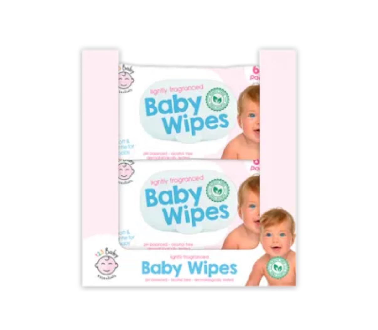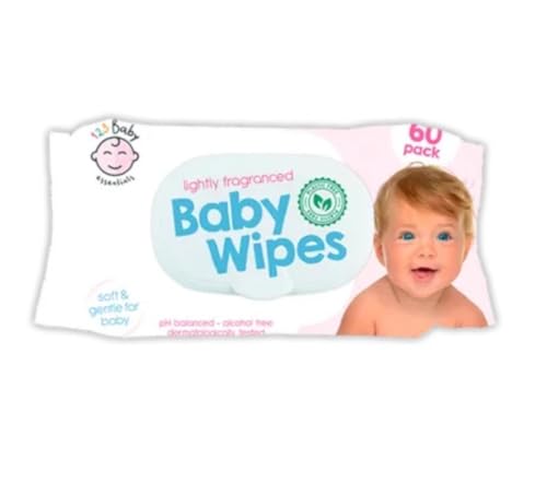 This pack of Fragranced Baby Wipes are lightly scented and soft and gentle for babies sensitive skin. Each pack contains sixty individual wipes. Each plastic free baby wipe is PH balanced, alcohol free and dermatologically tested, allowing for a gentle cleanse of baby’s delicate skin with soothing aloe vera and chamomile. Each packet of baby wipes features a plastic closure lid to keep wipes fresh.