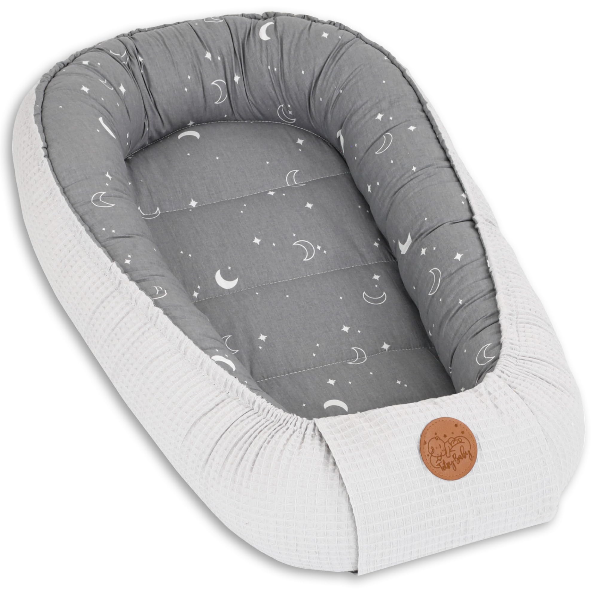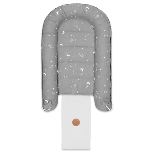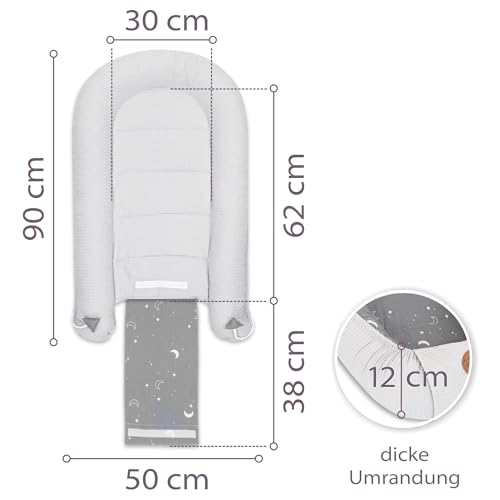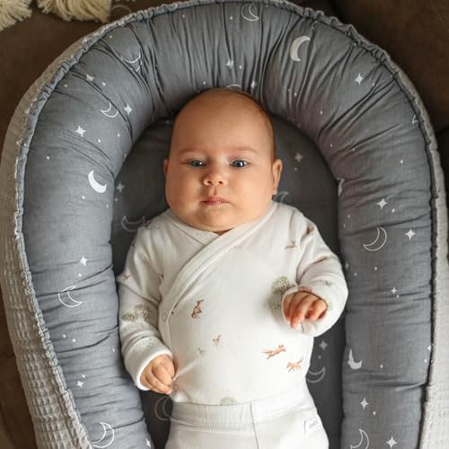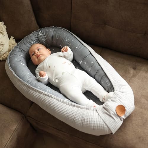Baby Nest Pod Bassinet Lounger – 90×50 cm Sleep Pod Newborn 0-36 Months Portable Co Sleeper Travel Furniture Cozy Snuggle Breathable Cotton Wafel Moons