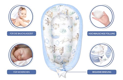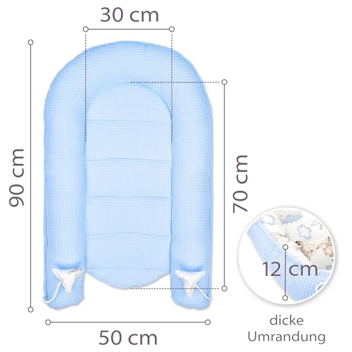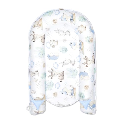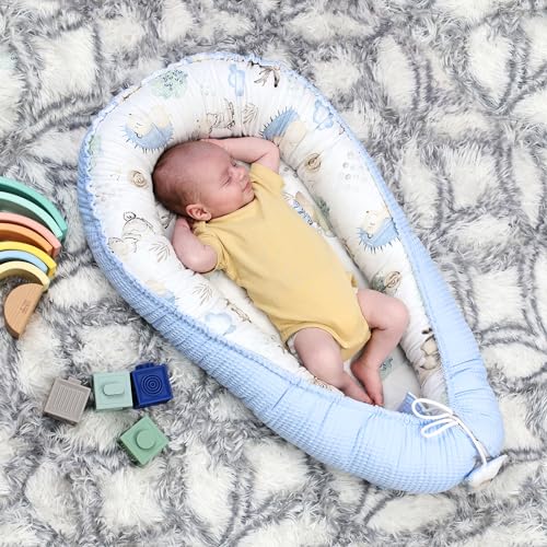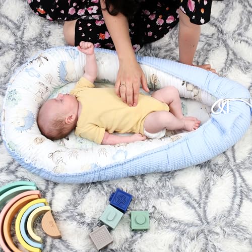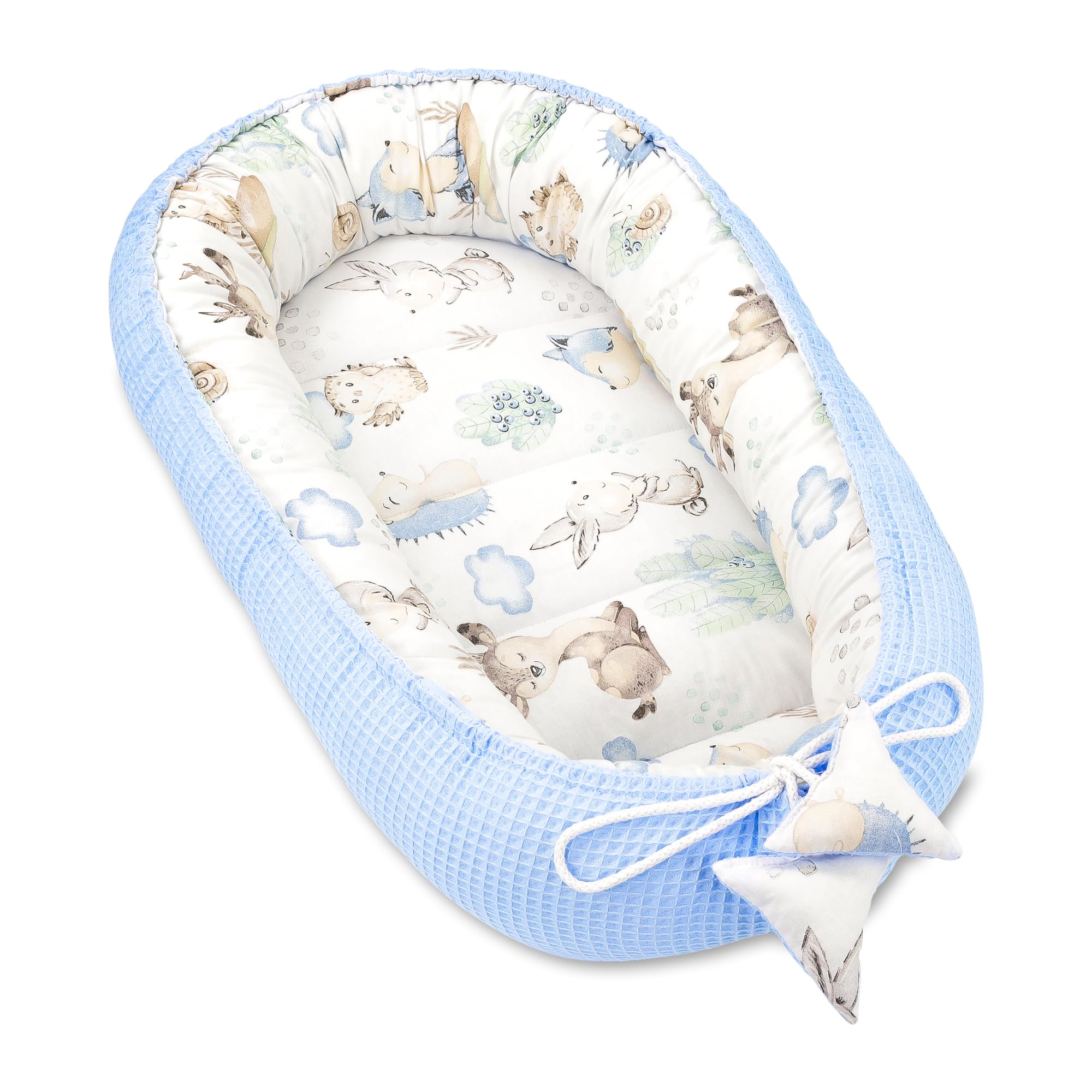 Baby Nest Pod Bassinet Lounger – 90×50 cm Sleep Pod Newborn 0-36 Months Portable Co Sleeper Travel Furniture Cozy Snuggle Breathable Cotton Wafel Animals Blue