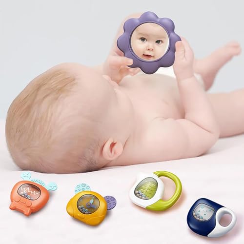 - 【5 In 1 All-Round Development】4 Removable sensory toys and 1 flower mirror, fully meet the baby's growth needs. 4 Toys: Baby teapot rattle, water cup rattles for newborn baby touching-growing,and TV rattle,clock rattle for improve baby responsiveness.Piano keyboards touching for graphics ,listening .All for colors cognitive. 1 flower mirror,as an important way for self-discovery.