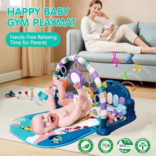 Baby Play Mat Gym, Funny Play Piano Tummy Time Activity Mat with 5 Infant Sensory Toys, Music and Lights Boy & Girl Gifts for Newborns 0 to 3 6 9 12 Months (Tiger Blue)