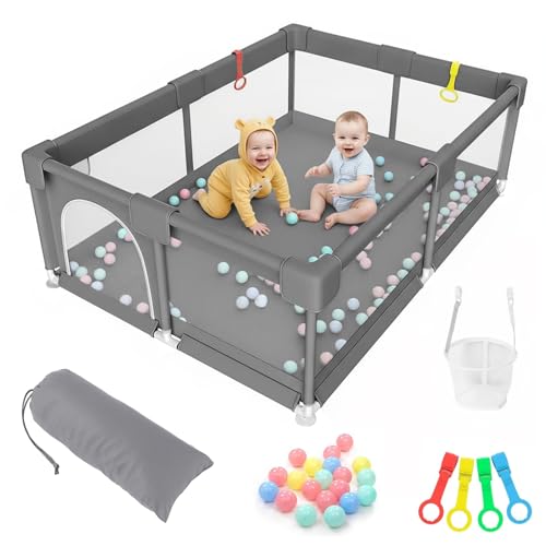 Baby Playpen, Large Safety Play Area, with Anti-Collision Foam Barrier with Breathable Mesh, Includes Ocean Balls and Pull Rings