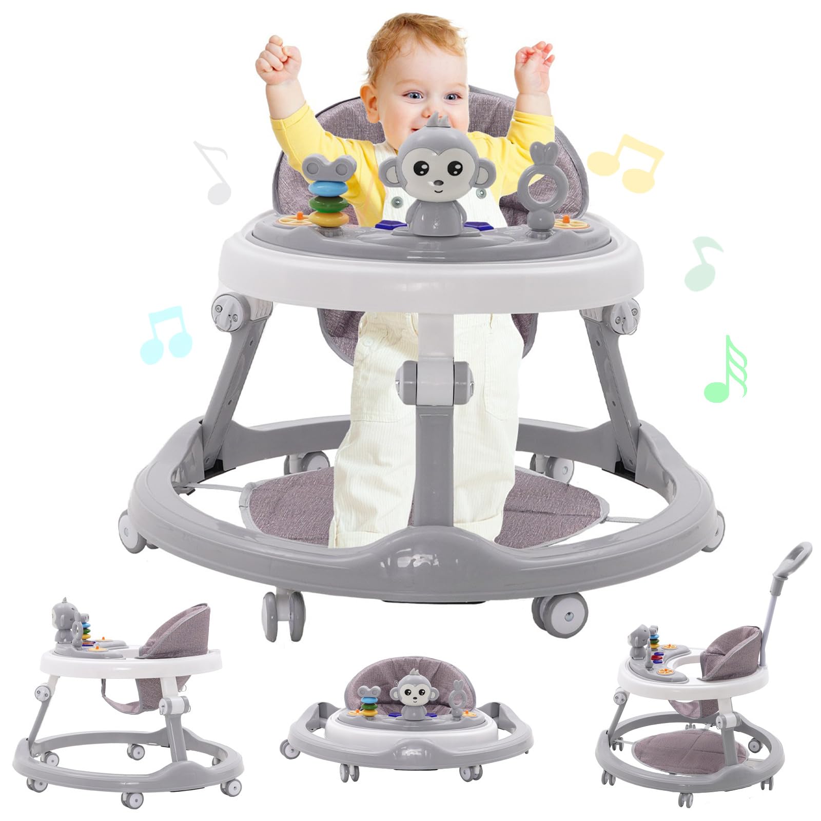 Baby Walker Foldable 3-in-1 Walker with Seat and Foot Pads Push Along Walkers with Light Song and Sound Anti-Rollover Baby Seat with Adjustable Height Compact Walker for Girls Boys