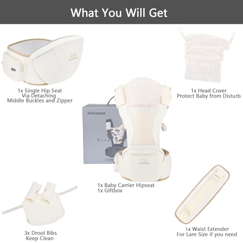 Bebamour Baby Carrier Newborn to Toddler Baby Carrier Hipseat 0-36Months with Head Hood, 3 PCS Teething Pads, Waist Extender, Storage Bag & Pacifier Case (Beige)
