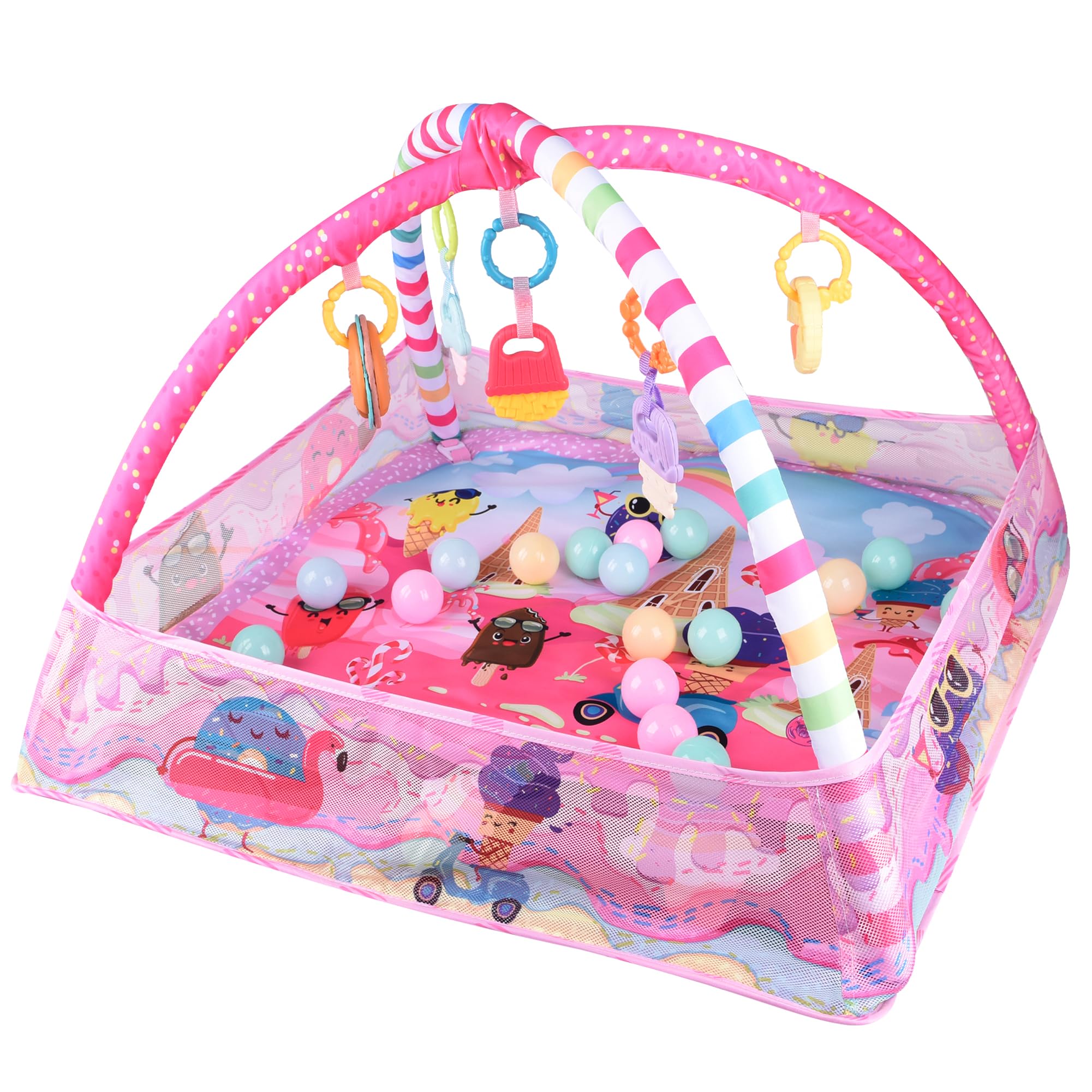 Bebamour Baby Playmats Floor Gyms from Birth, 18 Balls, 5PCS Hanging Toys, Soft Baby Play Activity Gym Playmats Floor Gyms for 0-24Months (Pink)