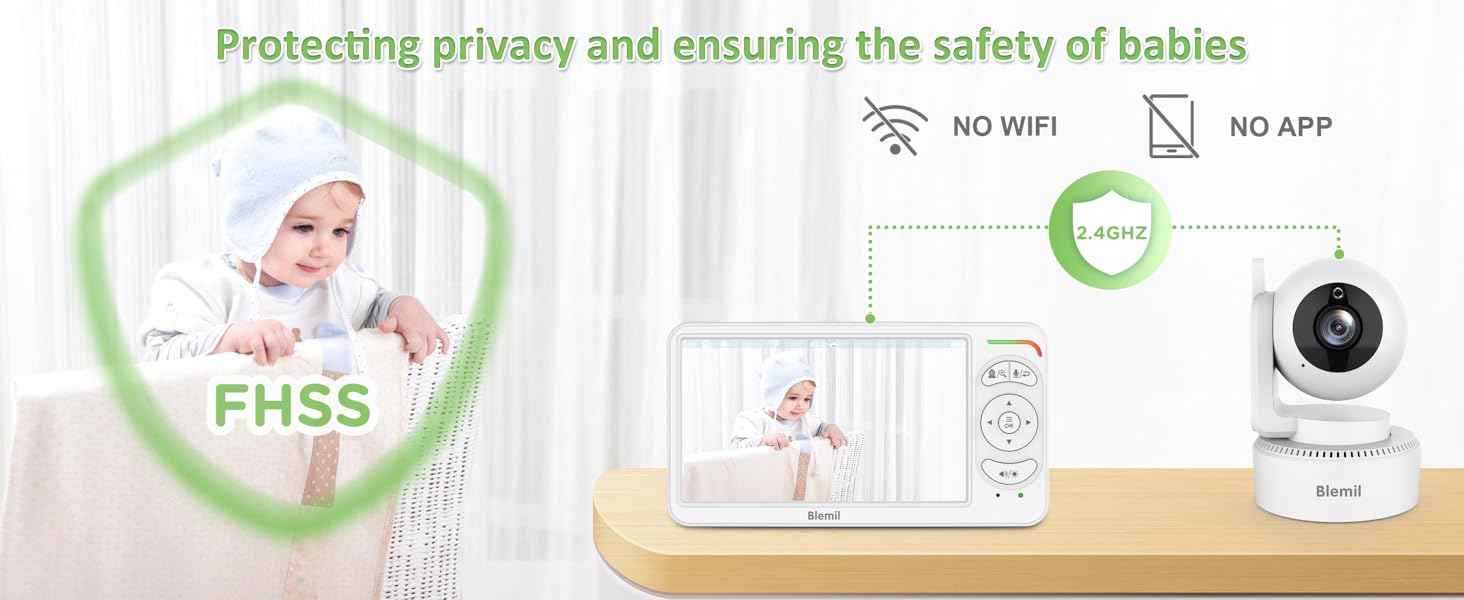 - 【FHSS secure connection】 No WIFI, use FHSS secure connection mode. Your baby monitor's field of view will only be visible to your own monitor, and no one can monitor your baby from any other way, protecting privacy and ensuring unparalleled security.