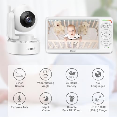 Blemil Baby monitor, Video Baby Monitor with 2 Cameras and Audio, 6 IPS Large Split Screen Remote Pan/Tilt/Zoom Baby Monitor, Video monitor cameras with clear night vision and 30hours battery Life