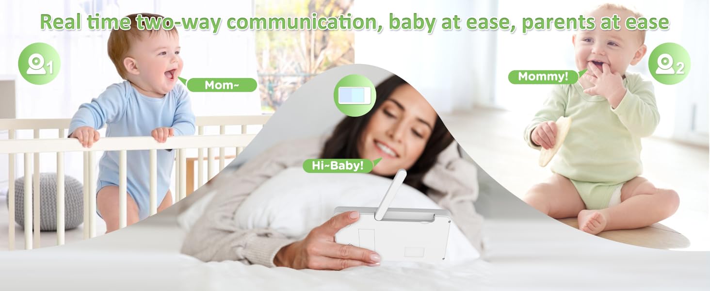 - 【ECO mode and cry detection】 In split screen mode, when the camera emits sound in the scene, the display will sound an alarm. In ECO mode, the screen will sleep to save power when the environment is quiet, and if your baby cries, the screen will immediately light up. This provides greater help for your baby's safety and environmental protection.