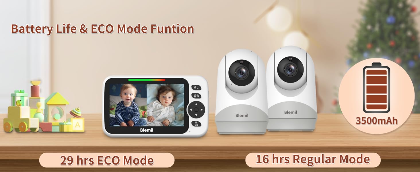 Blemil Upgrade Baby Monitor with 30-Hour Battery, 5″ Large Split-Screen Video Baby Monitor with 2 Cameras and Audio, Remote Pan/Tilt/Zoom, Two-Way Talk, Room Temperature, Auto Night Visio