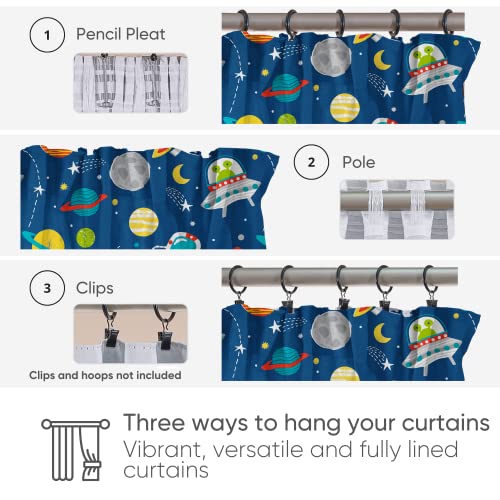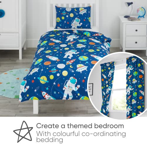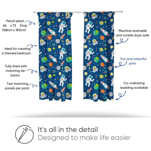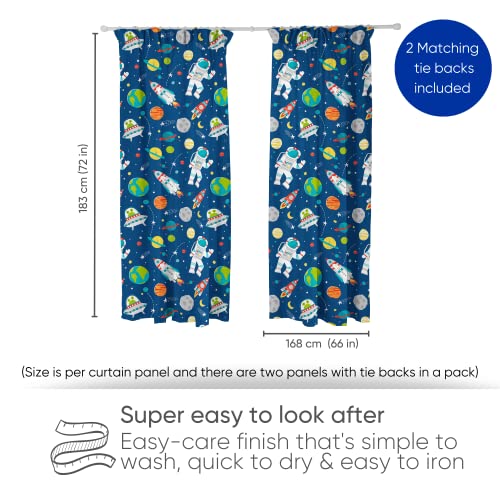 - PLAYFUL, COSMIC DESIGN: Perfect for budding astronauts! Blast off on a journey among the stars with this fun galaxy kids curtains set. They'll love settling down to sleep amongst the stars and it is great for little ones obsessed with outer space! Add our matching kids duvet sets for a coordinating finish.