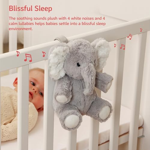 - Travel-Friendly Comfort: Meet Elliot Elephant, the travel-size plush companion. This cuddly friend provides soothing comfort with its white noise machine baby feature. Ideal new born baby essentials.