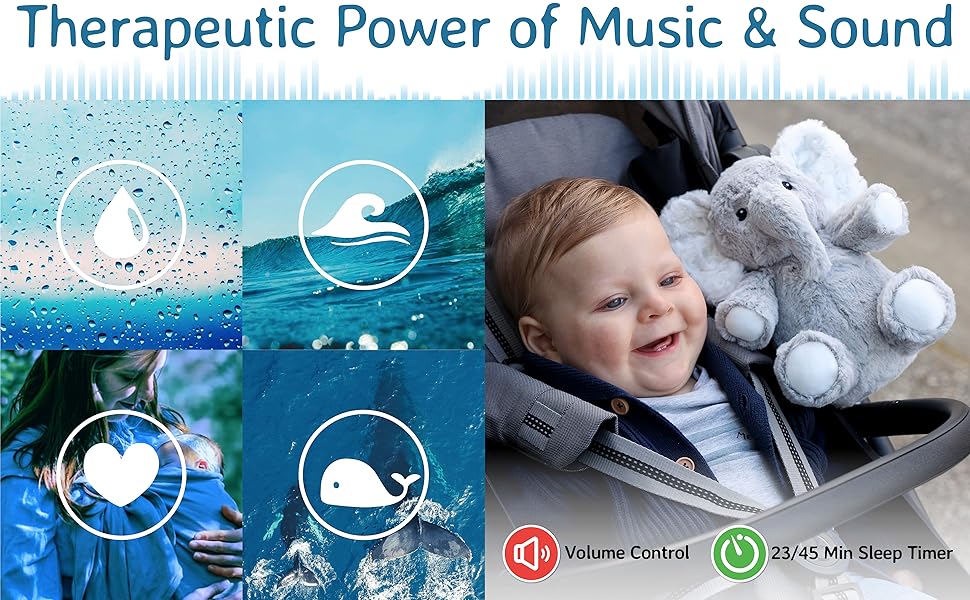 Elliot Elephant—The ultimate sleep companion. Featuring 8 soothing sounds & melodies : Heartbeat, Spring Showers, Ocean Surf, Whale Songs, Twinkle Twinkle, Rockabye Baby, Classical Lullaby and Tranquil Melody.