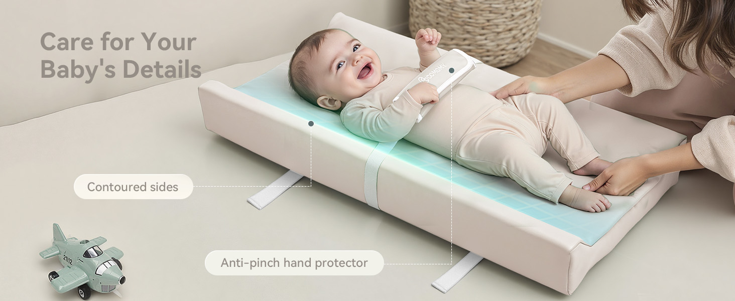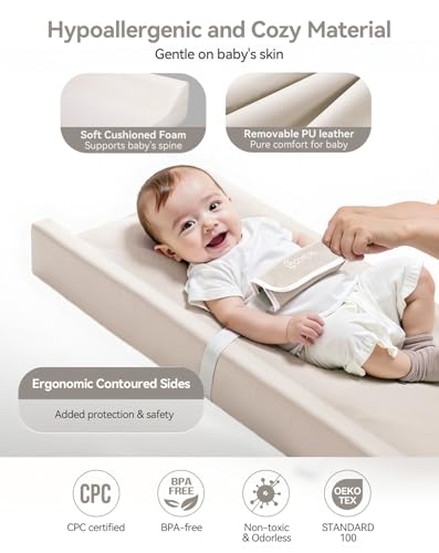 - 【Ergonomic Spine Support】The high-density polyurethane foam core provides optimal cushioning to support your baby’s delicate spine, reducing fussiness during diaper changes. Paired with contoured sides, the diaper changing pad cradles infants securely for comfort and safety