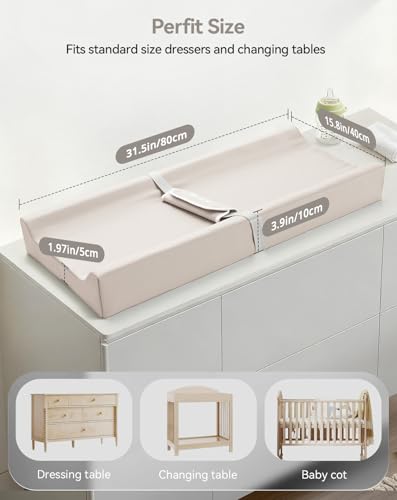 COMOMY Vegan Leather Baby Changing Mat with Waterproof and Soft PU Cover, Anti-Roll and Anti-Slip Wedge Changing Pad with Safety Straps, Portable Nappy Change Mat, for Dresser and Table, Beige