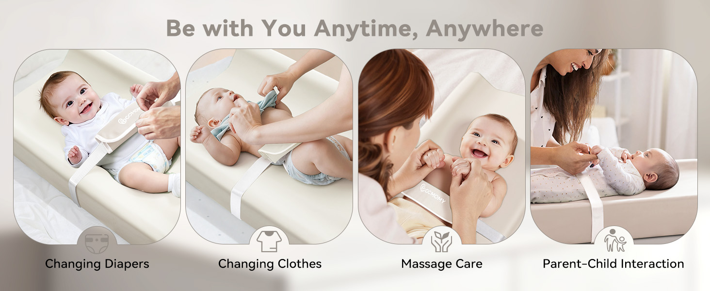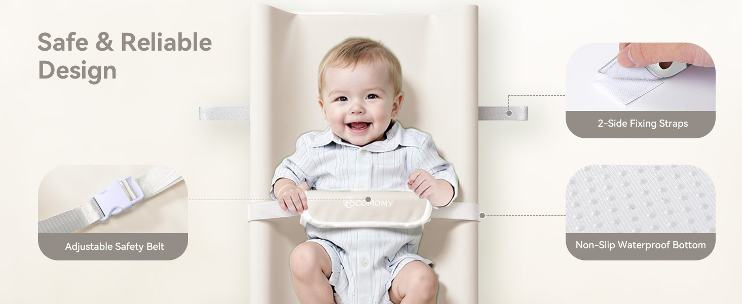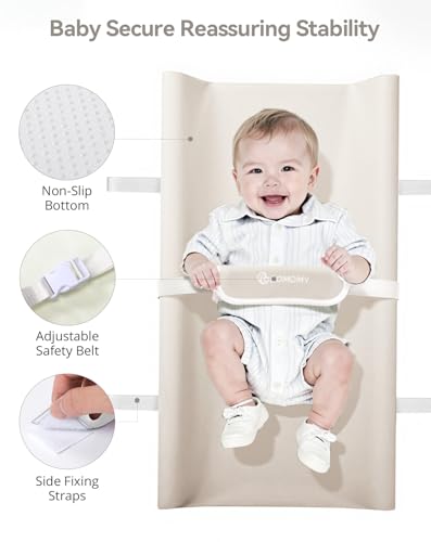 - 【Anti-Roll and Anti-Slip Safety Design】Curved edges with raised sides and adjustable safety strap keeps babies in place, while the soft buckle cover prevents skin irritation and pinched fingers. Paired with our non-slip base and anti-skid fixing straps, the wedge changing mat stays firmly planted on wooden dressers or travel cots. Designed for wriggly little explorers!