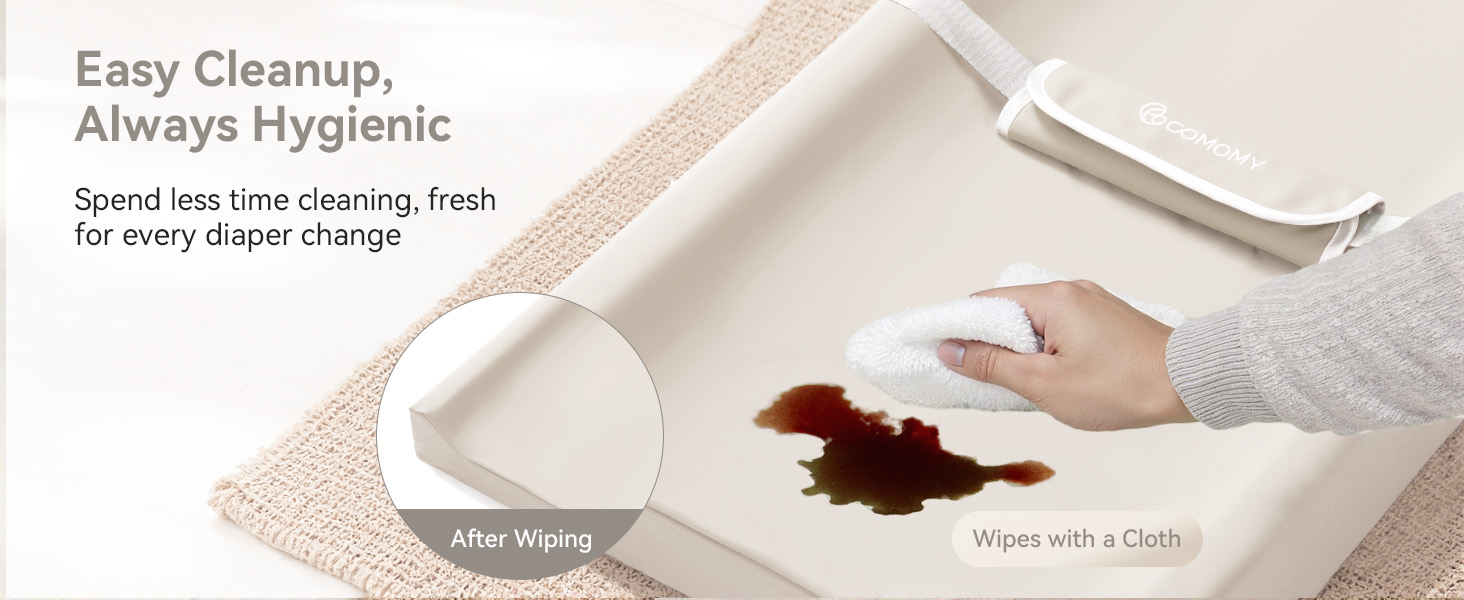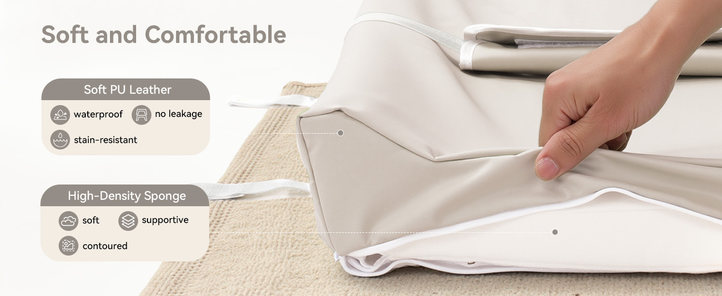 - 【Safe & Effortlessly Waterproof】Complies with safety standards and BPA-free, our baby changing mat features an ultra-gentle, solvent-free PU surface designed for delicate skin. Rigorously tested to be 100% leakproof and mess-proof, its non-toxic waterproof layer resists stains and wipes clean in seconds—no machine washing needed. The durable yet baby-soft material ensures lasting hygiene, nappy change after nappy change