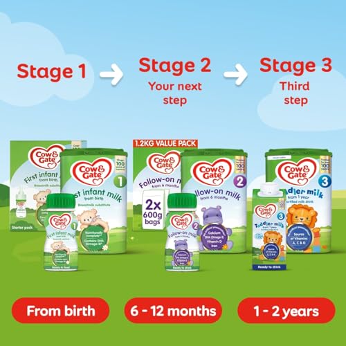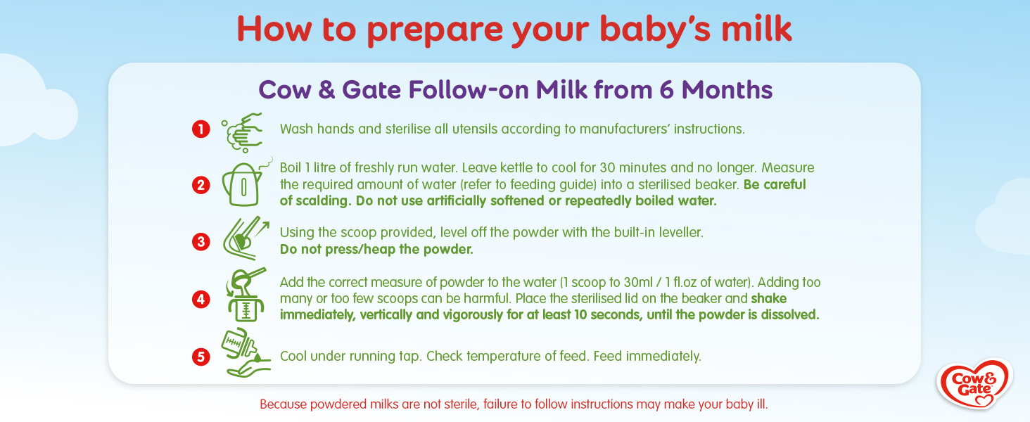 Important Notice: Breastfeeding is best for babies. Cow & Gate Follow-on milk is only for babies over 6 months, as part of a mixed diet. It should not be used as a breastmilk substitute before 6 months. The decision to start weaning including the use of this product before 6 months should be made only on the advice of a doctor, midwife, health visitor, public health nurse, dietitian, pharmacist, or other professional responsible for maternal and child care, based on baby’s individual needs. Dental Advice: Do not allow prolonged contact of milks with teeth and make sure your baby’s teeth are cleaned after the last feed at night. Ask your dentist for advice.