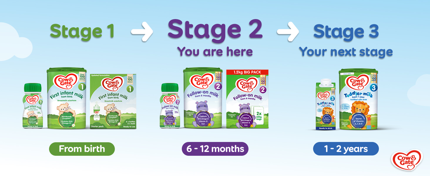 As your baby’s nutritional needs are changing, Cow & Gate Follow-On Milk is designed to support your little one’s nutritional needs* from when they start their weaning journey right up until their first birthday.