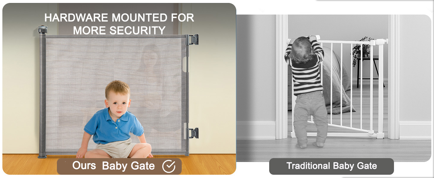 - Versatile: Retractable baby gate extends up to 55 cm wide and stands 83.8 cm tall, suitable for stairs, doorways, hallways, and outdoor use.