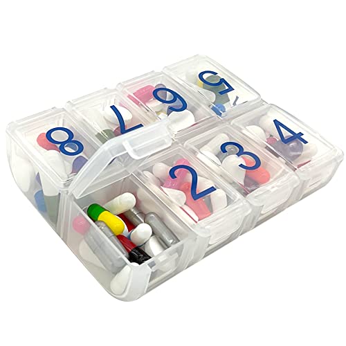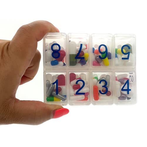 e-pill Large 8 per day weekly medication organizer. Includes eight (8) pillboxes each with eight (8) doses/medication compartments per day. Large daily 8 doses per day pill box labeled 1,2,3,4,5,6,7,8. Each dose (pill compartment) holds 25 aspirin sized pills. Organize all your daily medications once a week: Great pill organizer system for home, office or travel. Popular with Parkinson’s patients. Never forget to take your medications again!