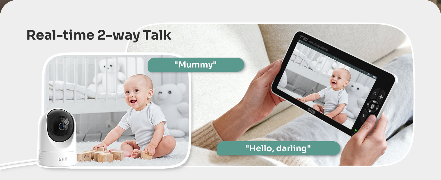- Crystal-Clear HD Video & 2-Way Talk: Watch your little one in vibrant detail on the 7-inch screen. Comfort your baby remotely with your voice through the two-way talk, or soothe them by playing one of the 8 built-in lullabies