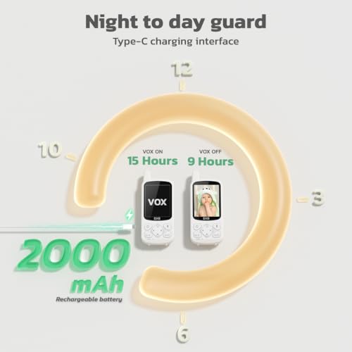 - VOX Power Save Mode: The screen is built with rechargeable battery, allowing operate continuously for about 9 hours (Note: The camera unit must remain plugged in during use). By activating VOX mode, the screen's battery life extends to up to 15 hours. In this mode, the screen automatically turns off and only wakes up when the camera detects noise above a certain level in your baby's room