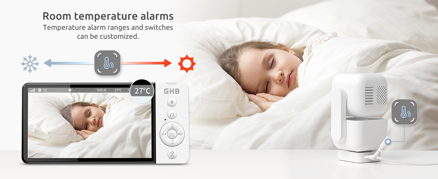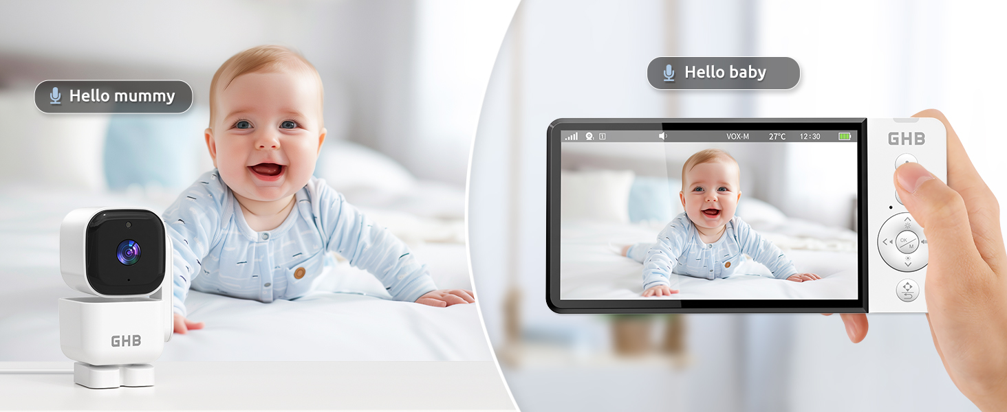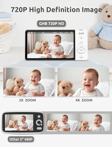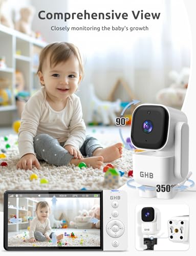 - HD Display: GHB baby monitor has a 5-inch large screen and a 720P high-definition resolution. The display utilizes the latest IPS technology, providing a viewing angle of nearly 180°. The camera unit can be remotely adjusted vertically within 90° and horizontally within 350° through the screen unit to ensure you never miss any of your baby's gestures or naughty smiles