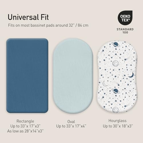 - ONE SIZE FITS ALL (33"x17"x4"): Designed for universal use, our bassinet sheets fit most bassinets, baby loungers, cradles, and co-sleepers. They accommodate standard, oval, round, rectangular, and hourglass-shaped mattresses. The elastic band provides a snug, secure fit while making sheet changes quick and easy