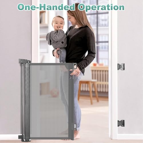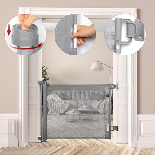 - 【Safe & Trip-Free Design】Unlike traditional gates, this retractable baby gate has no bottom rail, eliminating trip hazards when moving through with your hands full. A reliable top locking mechanism ensures children and pets stay safely where you need them.