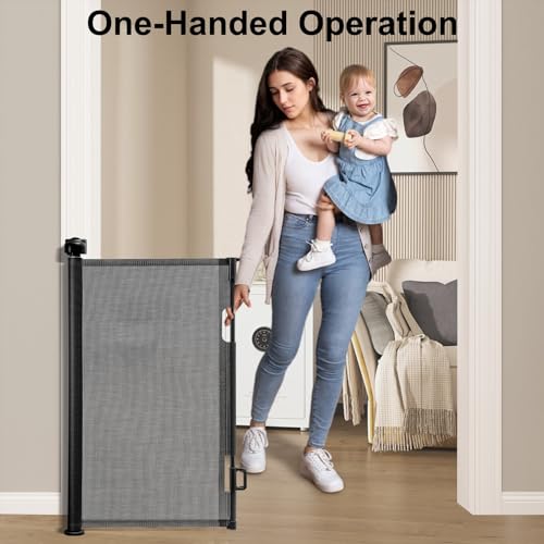 - 【Safe & Trip-Free Design】Unlike traditional gates, this retractable baby gate has no bottom rail, eliminating trip hazards when moving through with your hands full. A reliable top locking mechanism ensures children and pets stay safely where you need them.
