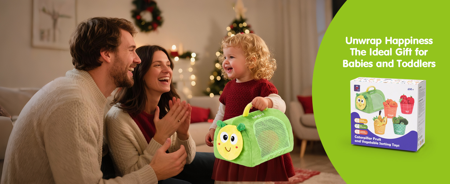 hahaland Baby Sensory Toys 6-9-12 Months, Plush Fruit & Veg Sorting Toy with Caterpillar Storage Bag, Colour Learning Basket Playset for Toddlers 1+ Year Old, Soft Educational Early Learning Gif