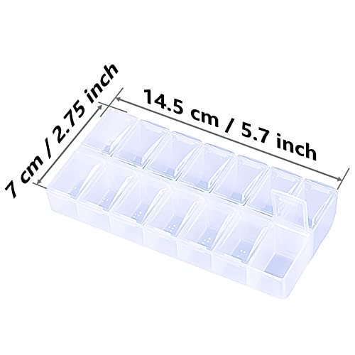 - —–Full Size: 5.7×2.75×0.86 inch.—-Each Cube Size: 1.2×0.8×0.86 inch.The plastic case is divided into 14 cubes. Each cube is lidded individually for us to organise different small items. It is clear and easy for us to identify contents inside and pick what we want.
