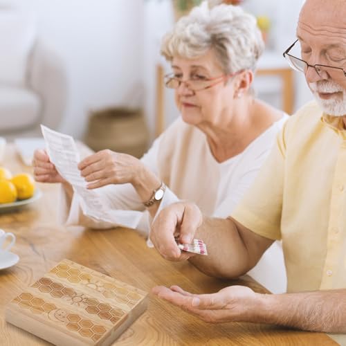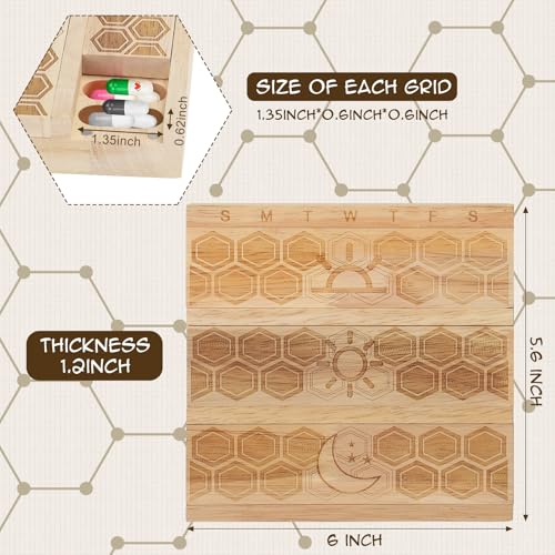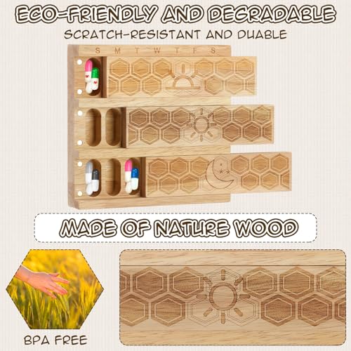 - Attractive Design: the appealing wooden pill box holder features clear engravings signifying 7 days of the week; Incorporated are depictions of a sun that is rising, the sun, and the moon symbolizing various times of the day; The distinctive honeycomb elements blend well with most tastes, making it aesthetically pleasing and practical