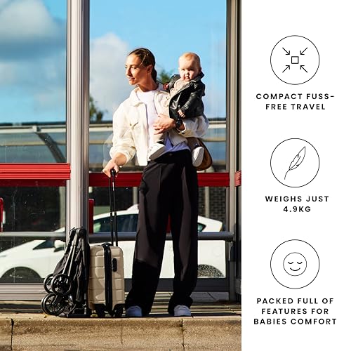 Includes stroller with 4.9kg frame, cabin-sized fold, two recline positions, adjustable calf rest, UPF50+ hood with sun visor & ventilation, suitable from birth to 22kg.