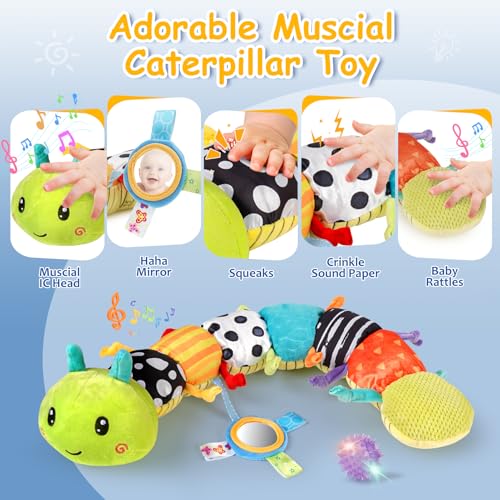 - 【Sensory Musical Toys】The caterpillar toy has musical sounds at the head and rattles at the tail. Various materials are used in the middle of the caterpillar to let the baby feel different touches, and there is also a mirror for self-identification. It has a 20 inch ruler on the back for parents to measure the baby's height.