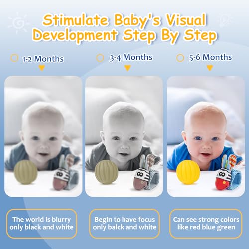 - 【Newborn Sensory Toys】 These sensory toys for infants 0-12 months promotes baby's visual stimulation, brain development, tactile cognition, and auditory congnition. It also improves baby's hand-eye coordination and grasping ability. Our colorful toys are suitable for parent-child interactive games and can be used as montessori toys and baby sensory toys, to promote the visual development and color perception of babies after 3 months of age.