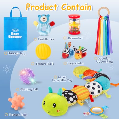 - 【Baby Sensory Toys】Our sensory toy set includes 10 PCS, 1 multifunctional caterpillar doll, 2 wrist rattles, 1 wooden ribbon ring, 1 plush rattle, 1 rainmaker, 2 textured balls, 1 light-up ball, 1 storage bag. Our newborn toys offer more accessories than other toys. These colorful baby montessori toys are perfect for tummy time and can be used as car seat toys, stroller toys, and crib toys.