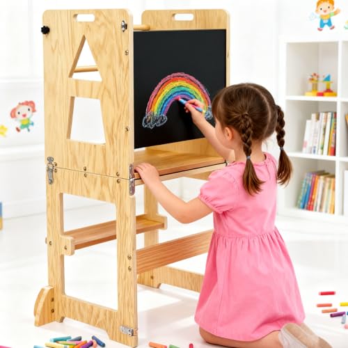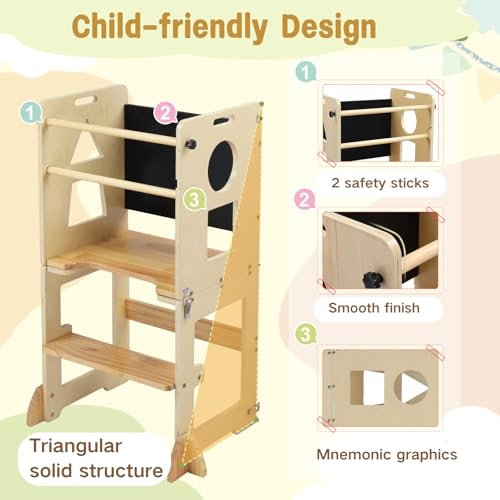 - 【Enhance Child Engagement】 The wooden step with a blackboard helps children reach countertops, sinks, and other high places, satisfying their curiosity and enhancing their hands-on skills. The different shapes of the side cutouts serve as handrails and help children memorize patterns
