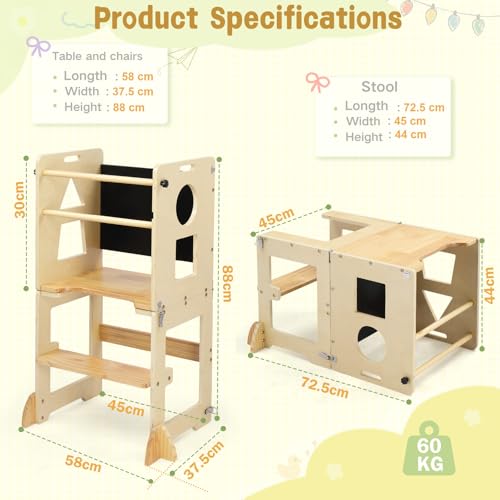 - 【3-in-1 Baby Learning Tower】 This kitchen tower toddler converts into a multifunctional children's table and chair with two anti-tip safety devices. It has a maximum load capacity of 60 kg and is suitable for children aged 1.5 years and up