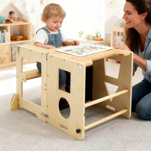 Karl home 3-in-1 Toddler Learning Tower, Wooden Kids Step Standing Stool, Transforms into Table & Chair with Chalkboard, for Kitchen Counter Load-bearing 60 Kg Oak Colo
