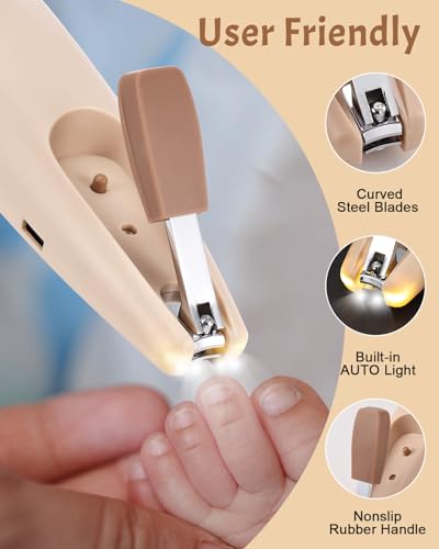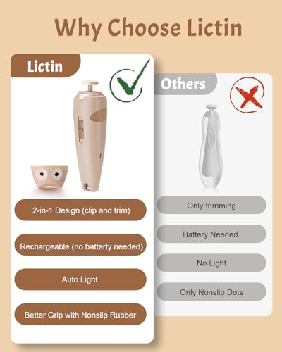 - 2 in 1 Nail Care Set with Auto Light (*Exclusive Patented Design*): Lictin baby electric nail file and nail clipper combine innovative design and functionality for the whole family. With a convenient 2-in-1 design, it features built-in automatic soft LED lights on both sides. These lights illuminate when the nail trimmer is in use, ensuring easy and precise trimming of baby's nails