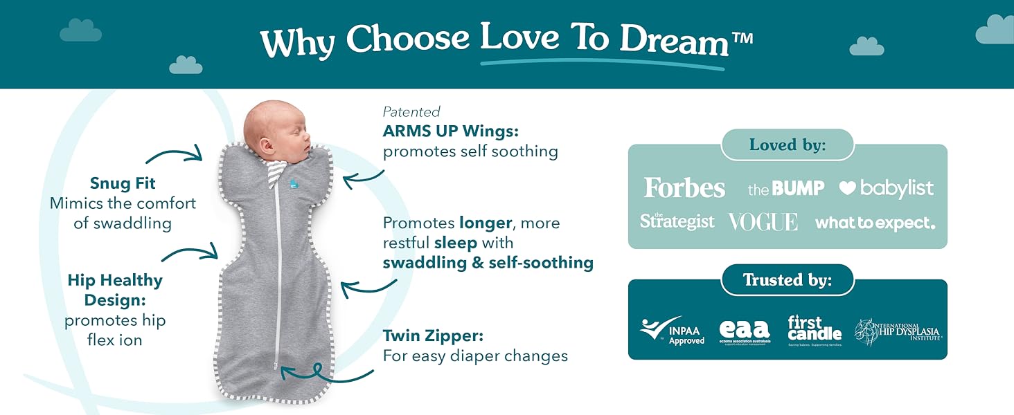 - – & : The Unique, award winning ARMS UP design allows your baby to sleep in their natural arms up sleep position. This allows them to safely to move their hands to their mouth for true Self- Soothing. Encouraging deeper, longer sleep helps to establish & maintain a healthy sleep routine from birth and throughout your baby's sleep journey.