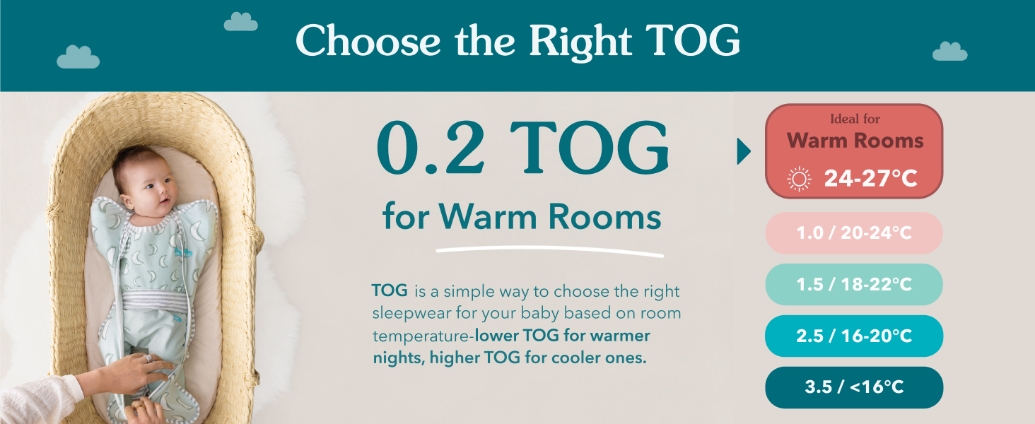 - – : designed with 0.2 TOG fabric – super soft, comfy, smooth to touch and airy. Stretchy for a snug fit across the torso to assist with self-soothing. An ideal choice for WARM room temperatures between 75-81 degrees