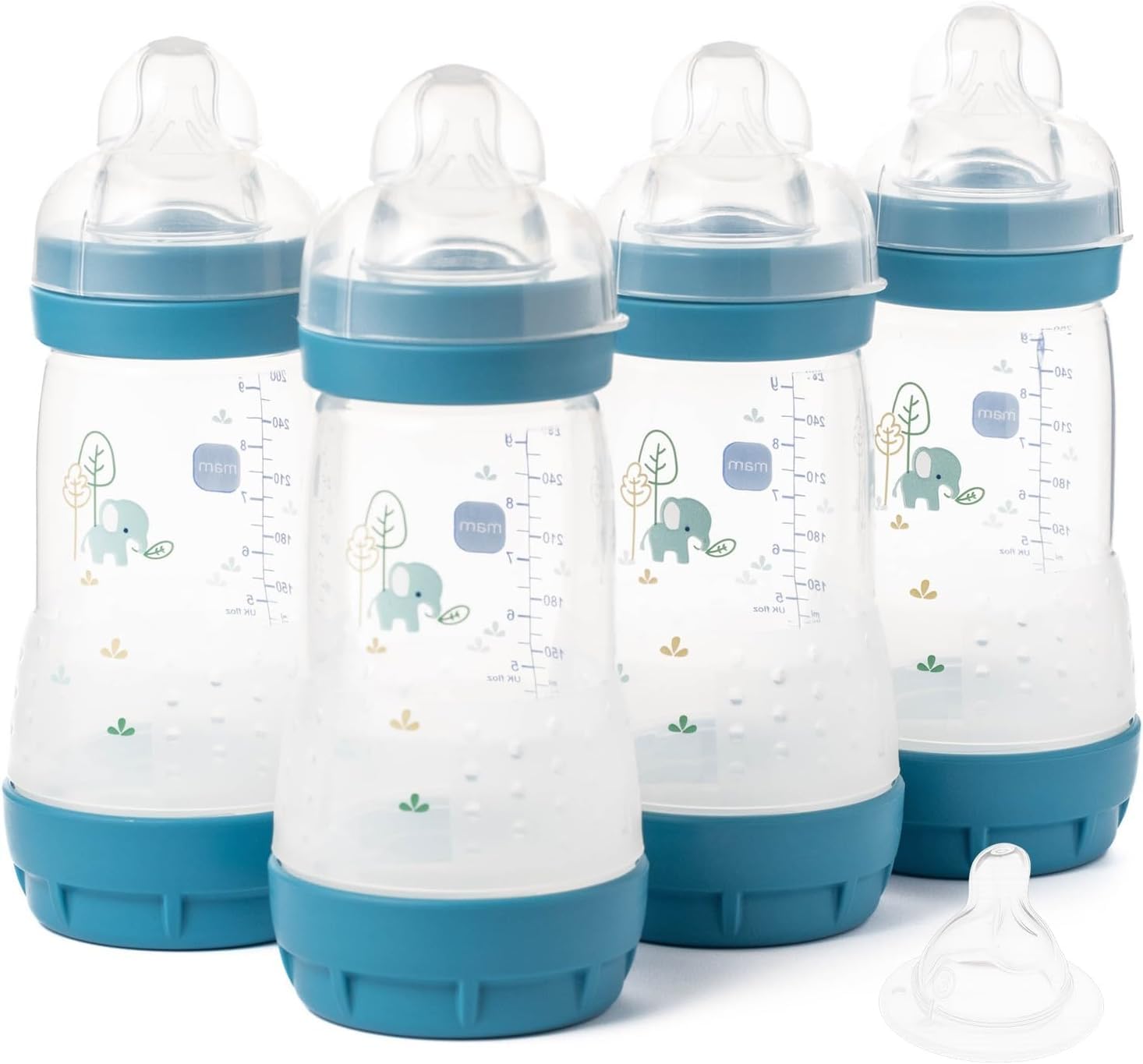 MAM Easy Start Anti-Colic Baby Bottles | 4 Pack (4X 260ml) | Self-Sterilising Baby Milk Bottle | Medium Flow MAM Teats Size 2 + 1x Fast Flow Teat Size 3 | Blue (Various Designs)