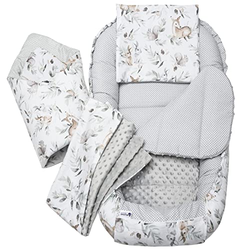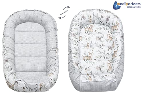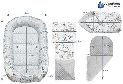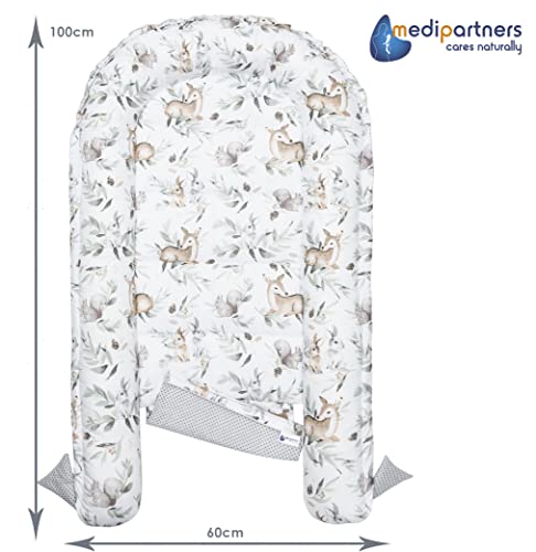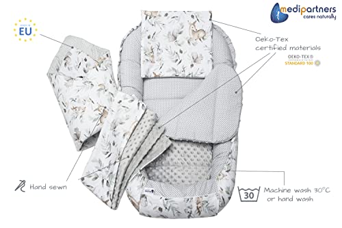 Medi Partners Baby Nest Pod for Newborn Babynest Bed 5pcs Set – 100x60x15 Lounger Essentials 0-12 Months sleeping bilateral Cocoon 100% Cotton (Deer in the leaves with grey Plush)