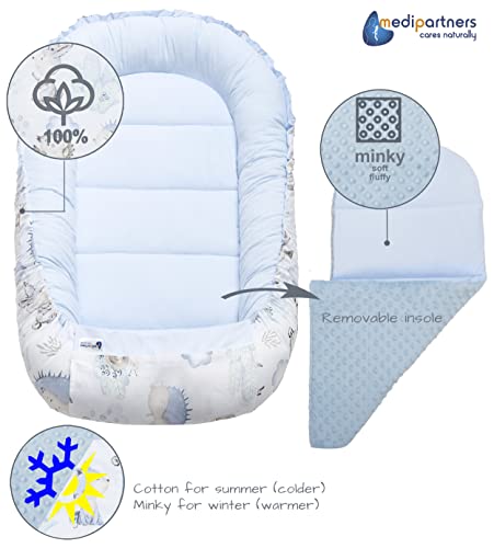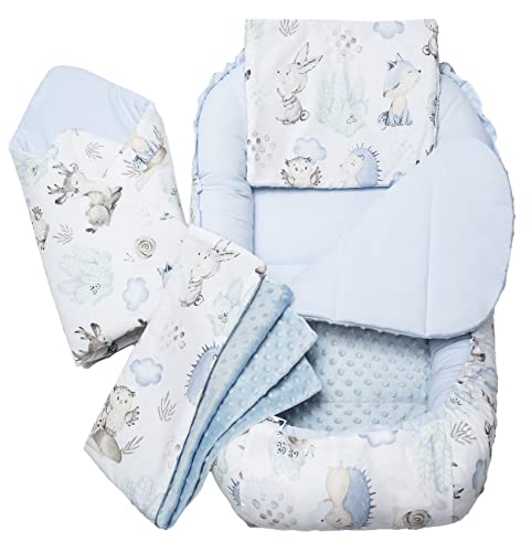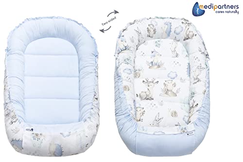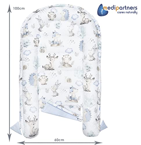 Medi Partners Baby Nest Pod for Newborn Babynest Bed 5pcs Set – 100x60x15 Lounger Essentials 0-12 Months sleeping bilateral Cocoon 100% Cotton (Deer and Hedgehogs with blue Plush)