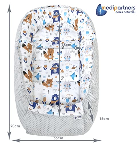 Medi Partners Baby Nest Pod for Newborn Babynest Sleep Bed – 100x60x15 Lounger Essentials 0-12 Months sleeping bilateral Cocoon 100% Cotton (Boho Animals with beige Plush)