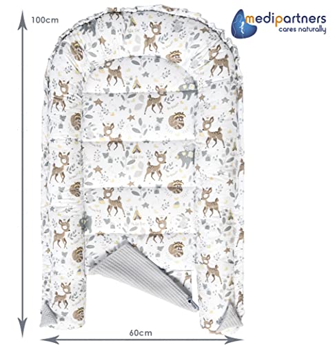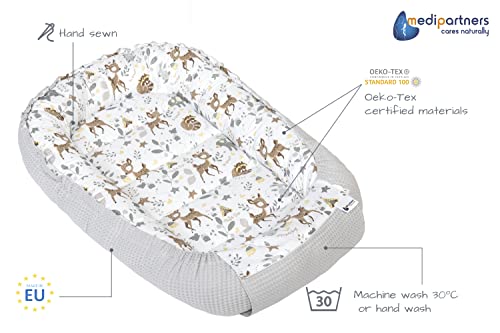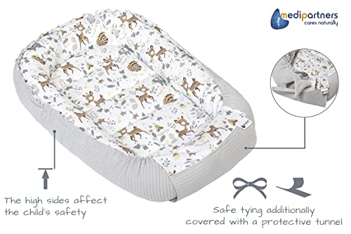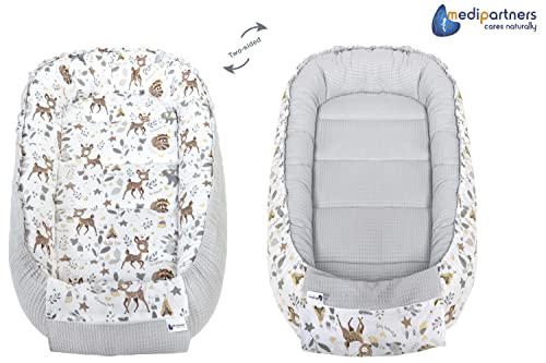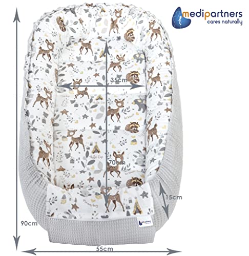 Medi Partners Baby Nest Pod for Newborn Babynest Sleep Bed – 100x60x15 Lounger Essentials 0-12 Months sleeping bilateral Cocoon 100% Cotton Waffle (Deer with grey Waffle)