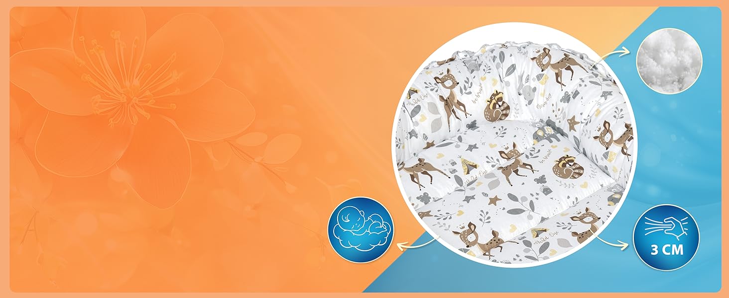 The baby nest wraps the child, ensuring comfort and security. It limits movement, giving a sense of protection. Adjustable drawstrings adjust the size, helping it grow with the baby up to 7–9 months.