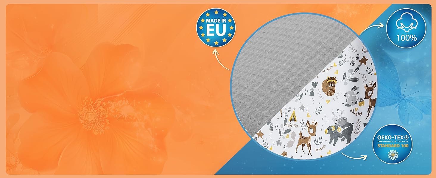 Made of thick, breathable 100% cotton 140 g/m² and cotton waffle fabric. Reversible design. Oeko-Tex 100 certified, free from harmful substances, and remains soft and durable.